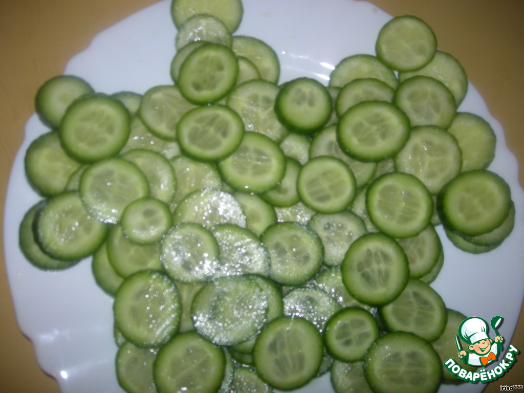 На блюдо выкладываем огурцы, нарезанные кружочками.