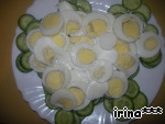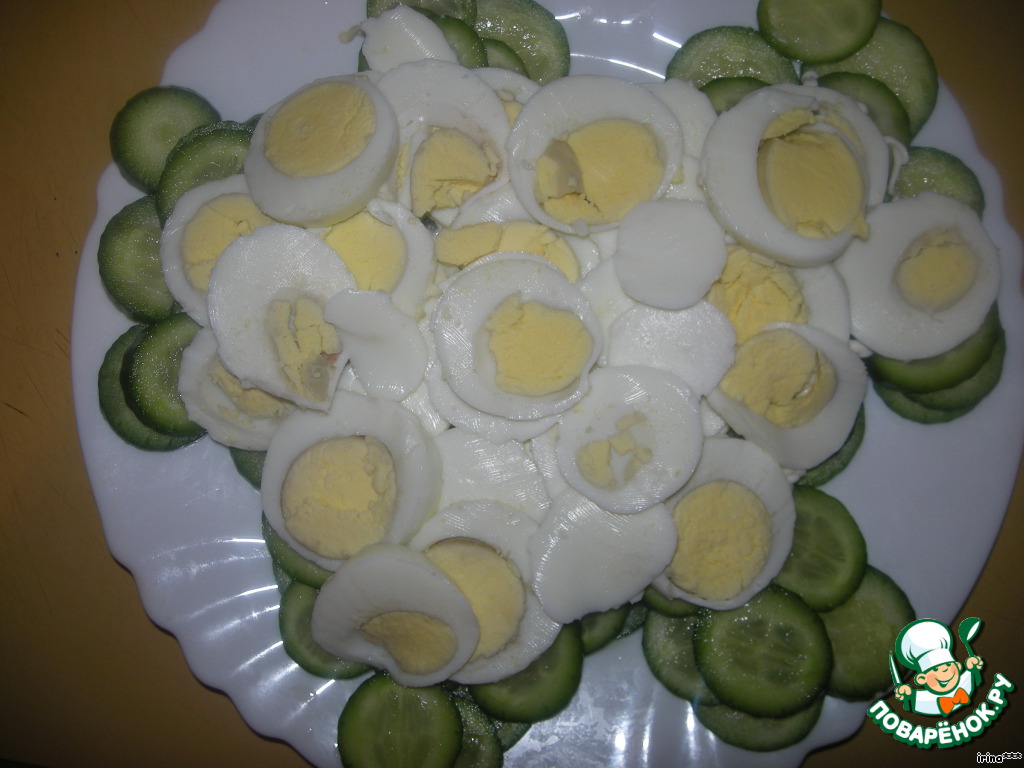 Затем слой отварных яиц - нарезать колечками.
