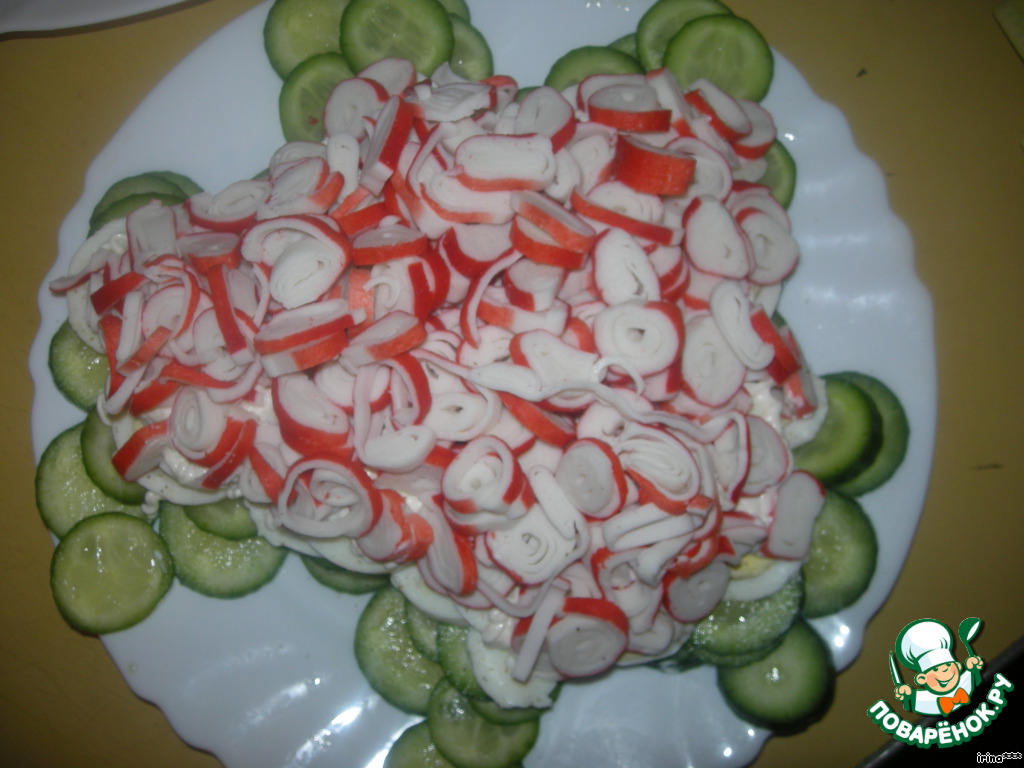 Следующий слой – крабовые палочки.