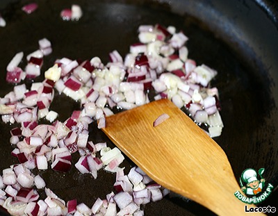 • Лук мелко нарезать и обжарить в небольшом количестве оливкового масла.