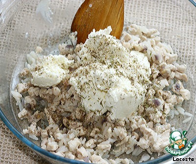 • Остудить рис с куриным филе. Добавить творожно-сливочный сыр, соль, черный перец и тимьян. Перемешать.