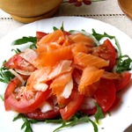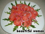 Это моe посвящение Иррез - солнечной, яркой, отзывчивой, прекрасной девушке! Этот салат поразил меня своим нежным, гармоничным вкусом. Горчинка рукколы, сочная мякоть помидорчика, хрустящий лучок и нежная форель - прекрасный творческий союз, дарящий наслаждение и блаженство. Обязательно побалуйте себя такой закусочкой!