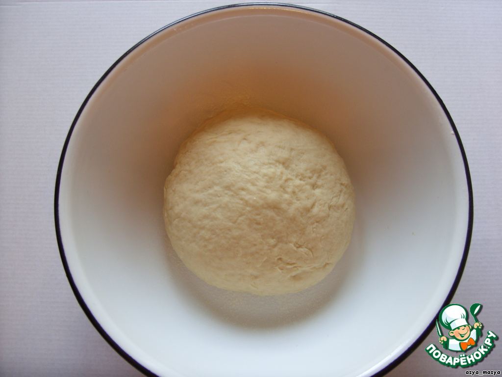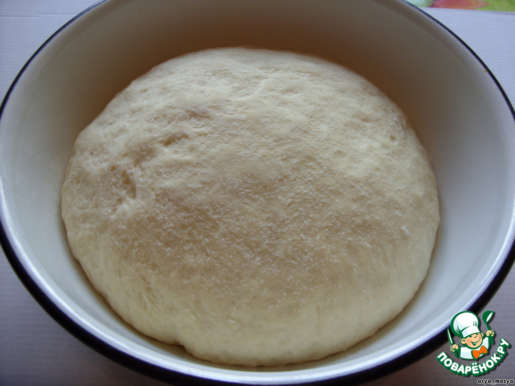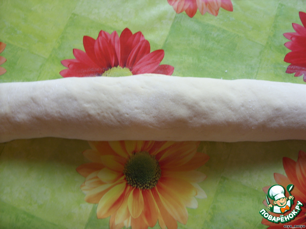 Достаём наше подошедшее тесто, хорошенько обминаем и раскатываем.