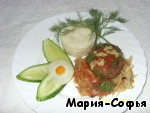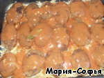 Собираем блюдо: в противень выкладываем капусту, сверху котлеты и поливаем все соусом.