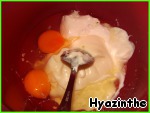 Смешали сметану, майонез, яйца (даже не миксером, просто ложкой или веничком). -