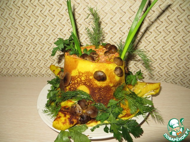 Теперь аккуратно, но плотно скатываем блины в рулет. Получившийся рулет выкладываем на блюдо морковным слоем вверх. Если на блюде неаккуратно торчат края блинов, их можно подрезать. Собственно, пенек готов. Остальное - дело фантазии. Мой растет на травке (листовой салат), корни - из обрезков блинов, опята я посадила, сделав в пеньке дырочки ножом (если грибочки не хотят держаться, можно посадить их на зубочистки, но предупредить всех участвующих в трапезе),