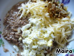 Тунец, лук, сыр и яйцо перемешать