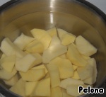 В другой кастрюле отварить нарезанный небольшими кубиками картофель в подсоленной воде. Вынуть картофель и переложить в кастрюлю с томатным соусом.