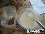 Отдельно смешать муку, разрыхлитель, соду, какао и просеять эту смесь в жидкие ингридиенты -