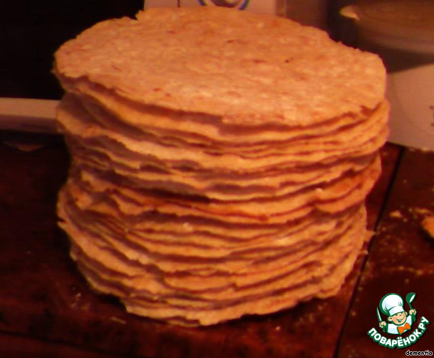 . Последний корж пеку из "обрезков" и остатков, получается, мягко говоря, корявенький. Его надо подольше подержать в духовке, чтоб он как следует загорел, т. к. пойдет на посыпку.