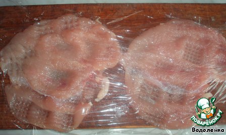 Теперь берем пищевую пленку и выкладываем наше отбитое филе в длину, с нахлестом друг на друга.