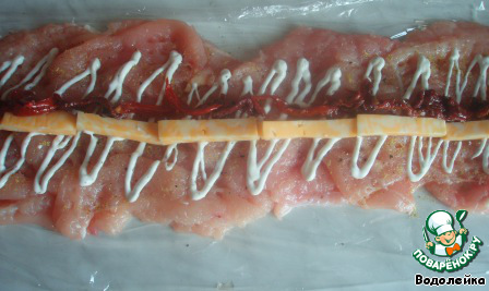 И дальше играет роль ваша фантазия. Я смазала майонезом, выложила посередине по длине полосочки твердого сыра, сушеные пряные помидорчики (https://www.povarenok.ru/recipes/show/31010/). -