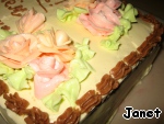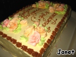 Дальнейшие действия требуют определённых навыков, кто умеет обращаться с корнетиком, описания ему не нужны. Скажу только что масло сливочное я взбила миксером с 0,5 стак. сахарной пудры, добавляла различные пищевые красители и крутила розы. Украсила надписью, уложила розы, листики к цветам сделала и в самом конце бортик.