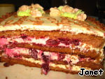 Промазать каждый корж кремом, вишню разделить примерно на 3 части, выложить между коржей на крем. Сверху на сформированный торт вишню не укладываем!