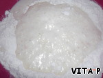 Постепенно подсыпаем понемногу муки, чтобы тесто не липло к рукам, отбить об стол готовое тесто и оставить на пару минут.