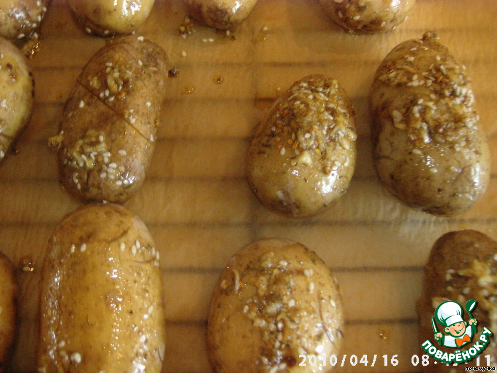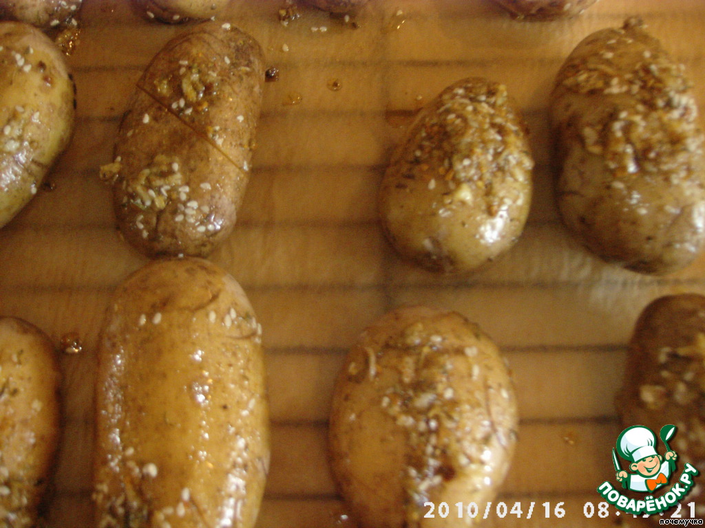 Картофель хорошо смазать полученным соусом, стараясь также промазывать в местах разрезов и выложить на смазанный маслом противень. Запекать в духовке до готовности.