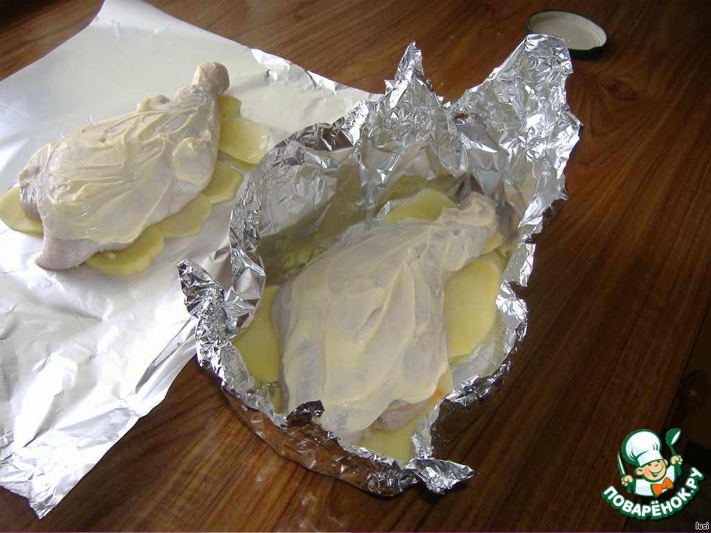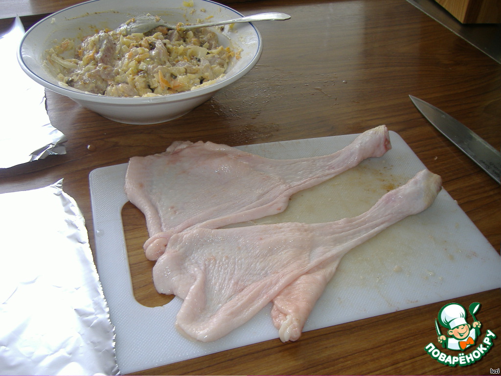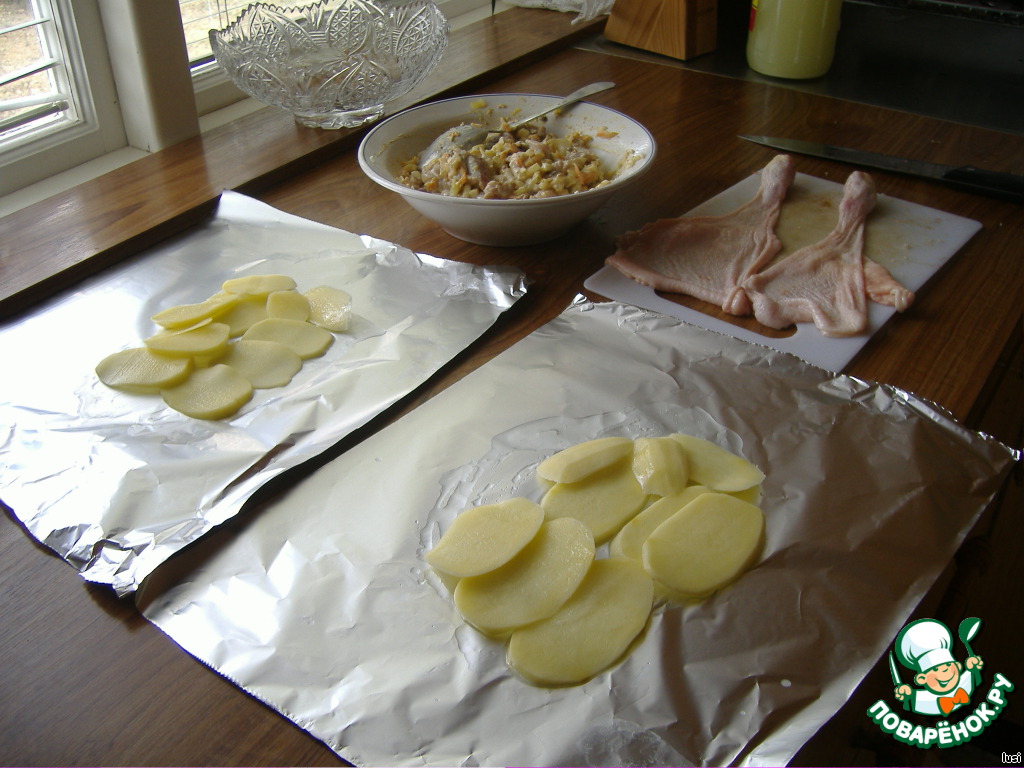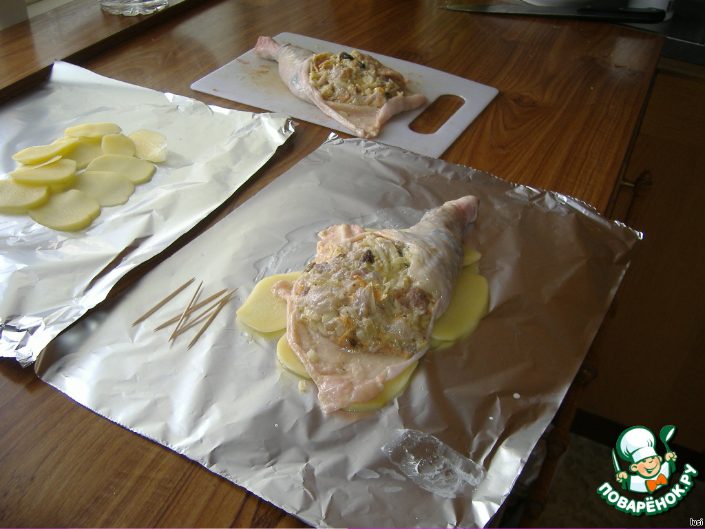 4. Кожу окорочков аккуратно заполняем приготовленной массой, скрепляем палочками или нитками и укладываем на картофельные кружочки в фольге.