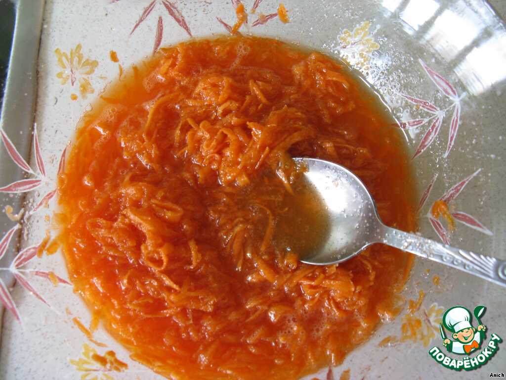 Все тщательно перемешиваем. Тесто должно получиться консистенции густой сметаны. Если у Вас морковь была не очень сочная, и тесто получается сухим (при перемешивании не получается однородная масса), то можно добавить 2-3 ст.ложки воды.