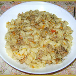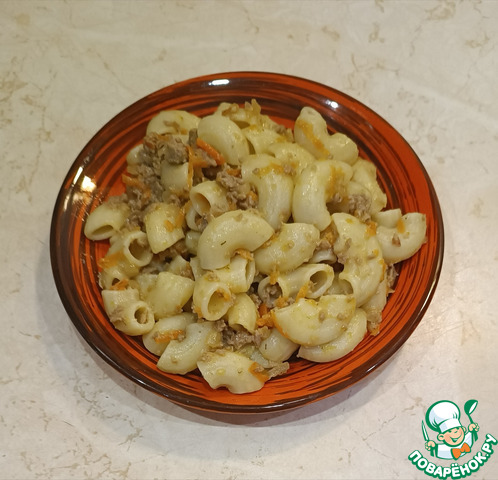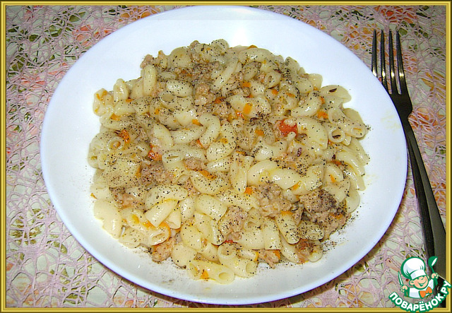 Затем выложим макароны к фаршу. Тщательно перемешаем, накроем крышкой и можно снять с огня, чтобы макароны минут 5-7 пропитались.