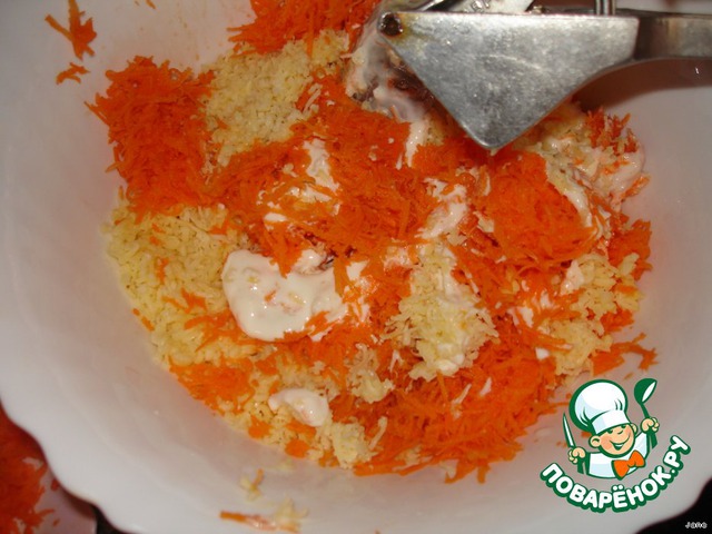 Все смешать, заправить майонезом, выдавить чеснок. Тщательно перемешать.