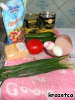 Примечание: для удобства можно начать выкладывать салат со средней полосы (куриного филе или колбасы), а от неё к краям с обеих сторон продолжить все остальные слои. -
