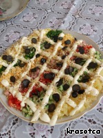 Я взяла слишком маленькое блюдо и поэтому у меня не поместилось 2 слоя (орехи и маслины). Я ими украсила салатик: орехами посыпала салат, сделала майонезную сетку и в пустоты выложила маслины. -