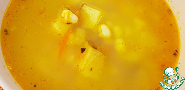 4 ) За 15 мин. до готовности открыть банку фасоли и вылить вместе с соком в кастрюлю.