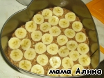 Выложите эту массу в небольшую форму с разъемными краями и разровняйте хорошо придавливая ложкой. Сверху выложите порезанный банан.