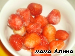Еще до начала приготовления тортика - разморозить клубнику (у меня было мало, поэтому положила сколько есть, лучше, если он весь будет заложен клубникой. Также это могут быть и другие ягоды, фрукты (вишня, дольки мандарина и т. д.)