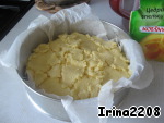 БОльшую половину теста распределить с бортиками в форму. На него - нарезанные яблоки -