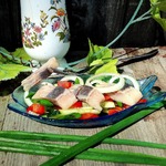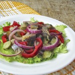 Выкладываем на тарелку хаотично, в любом порядке. Поливаем заправкой и приглашаем к столу.