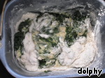 И шпинат. Часть жидкости от шпината можно слить, последить за колобком и долить по необходимости. Советую так сделать, чтобы тесто не получилось жидковатым, потому что у всех разная мука и разный шпинат.