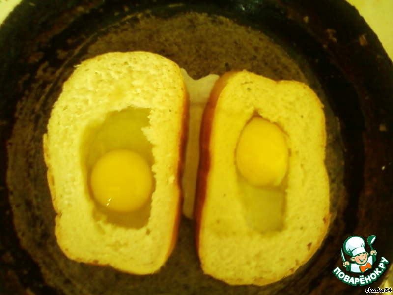Затем очень аккуратно разбиваем в углубления по яйцу. Если вдруг белок начинает просачиваться под батоном (это говорит о том, что ломоть отрезан не ровно), то просто прижмите его (батон) к сковороде вилкой и подержите, пока белок не начнёт застывать! Солим по вкусу