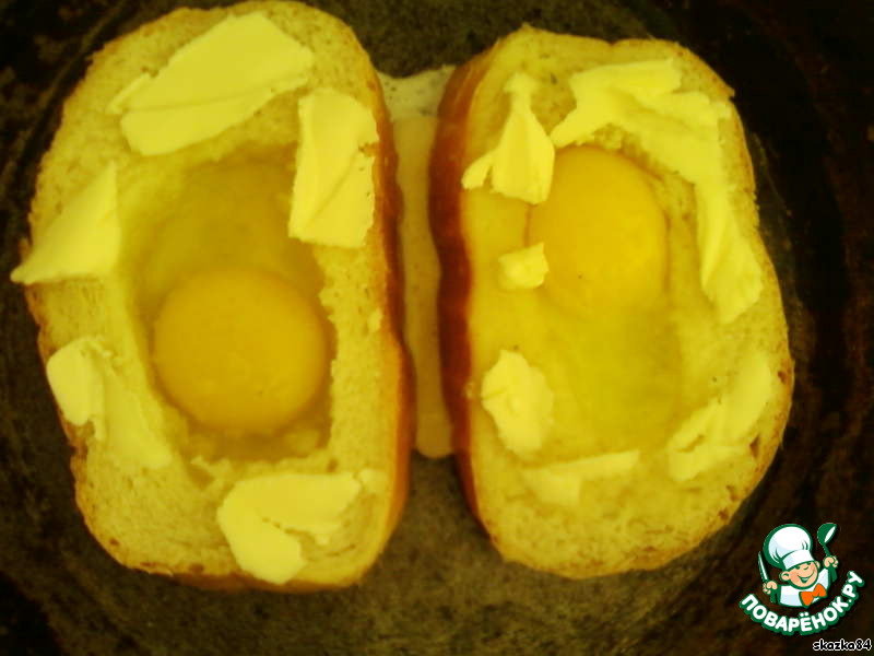 • Вбив яйца, аккуратно выкладываем масло и на верхнюю сторону. Закрываем крышкой. Масло пропитает батон и даст потом поджаристую корочку