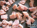 Ветчину нарезать небольшими кусочками, обжарить на разогретой сковороде.