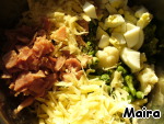 Капусту, горошек, яйцо, ветчину и сыр перемешать, заправить майонезом.