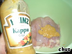 Сначала начинку приготовим - куриное филе замариновать, как вы любите, я мариновала в соусе карри, с горчицей, солью, перцем - минут 40-60