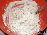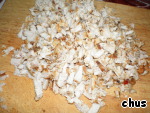Творожный сыр протереть, добавить порезанный укроп, растертый чеснок, кусочки курицы и грецкие орехи.