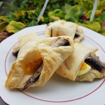 Положить на каждый ромб по 1 шпроте, четвертинке яйца и немного лука (его порезать полукольцами и ошпарить кипятком).