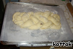 3. Подошедшее тесто разделить на четыре равные части, каждую из которых отдельно раскатать скалкой в прямоугольник, посыпать по всей площади поверхности изюмом и туго скатать рулетом по длине. (Если добавлять повидло, оно должно быть густое, его нужно выложить не толстым слоем и одного из краёв прямоугольника и аккуратно свернуть (но туго, после того как повидло завернулось первым слоем). На противень, застеленный пергаментной бумагой, выложить все четыре рулета, защипнуть края и заплести плетeнкой (как косу).