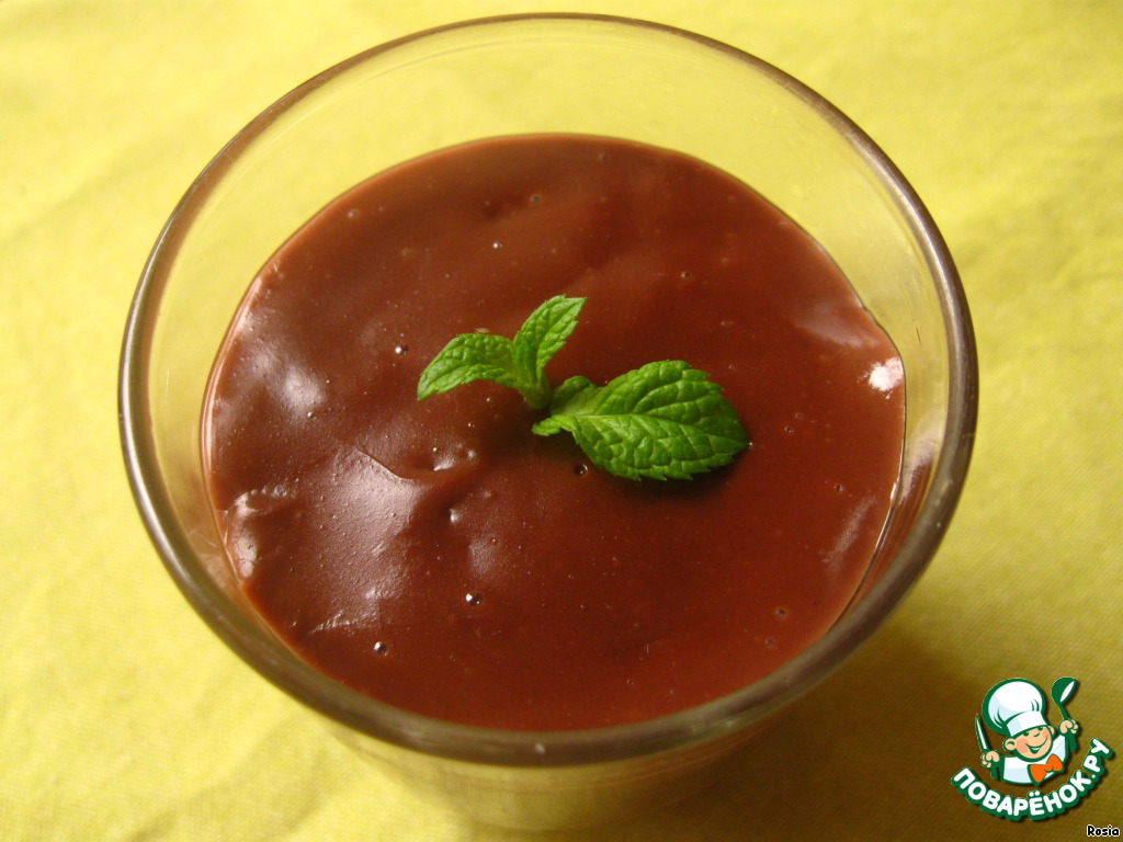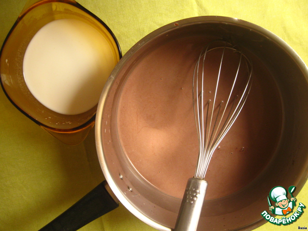 Молоко с какао и сахаром ставим на средний огонь. Не доводя до кипения, вливаем в него молоко с мукой и крахмалом. Варим до загустения, постоянно помешивая.