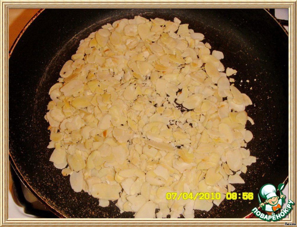 Заранее подготовим миндаль, обжарим, 2 ст.л. отложим, остальное промолоть в кофемолке