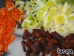 Сушеные абрикосы, лук, лук-порей, морковь нарезать и все добавить к мясу.