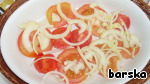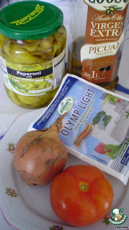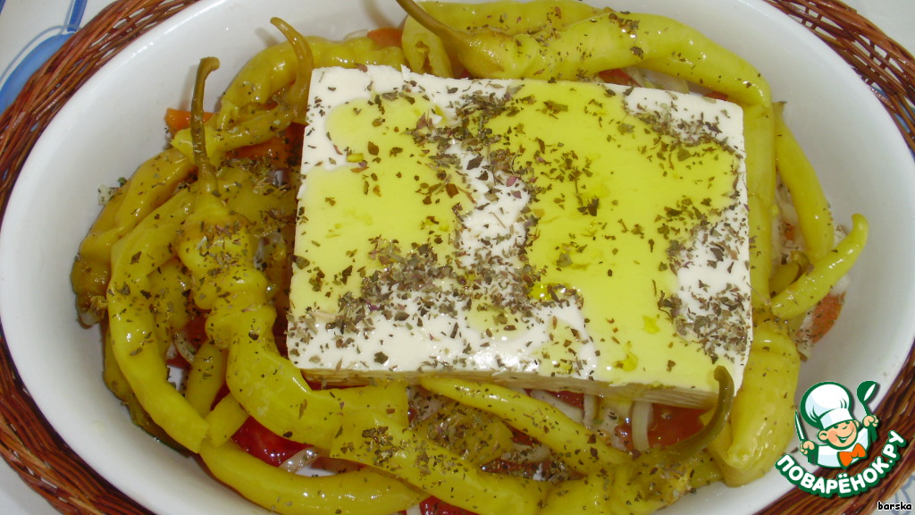 В жаростойкую форму выложить помидоры, нарезанные кольцами. На них сверъу выложить репчатый лук, сверху положить кусочек сыра фета, а по бокам - пеперони, полить оливковым маслом, посыпать орегано.