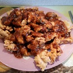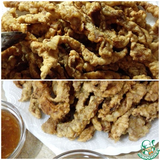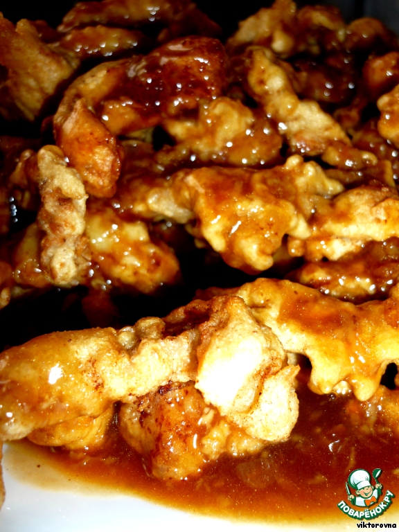 Теперь выложить мясо на блюдо и полить получившимся соусом, можно и наоборот - мясо в соус, но затем сразу вытащить и на блюдо, тушить не нужно, иначе кляр размякнет и не будет хрустеть.