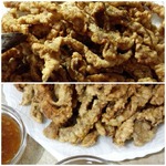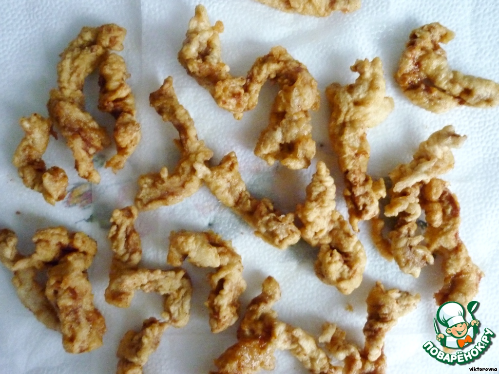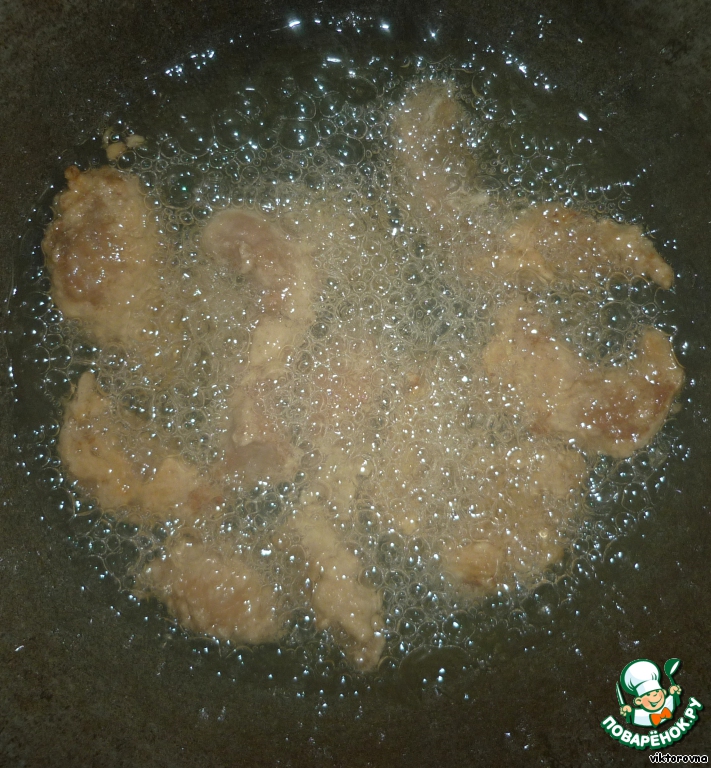 Жарим мяско во фритюре, опять же люблю использовать китайские палочки, а другой рукой, мокрой, аккуратненько, чтоб не слиплись, по очереди выкладывать в масло.