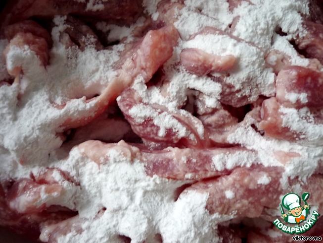 Мяско режем полосками, тоньше - лучше, добавим 2,5 ложки крахмала,