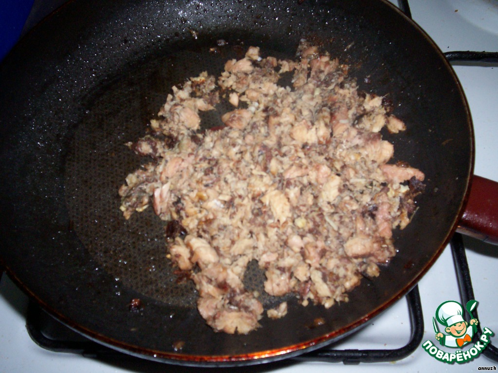 Пожарить лук, грибы и вот тут - моя случайность, я по ошибке вместо грибов поджарила рыбную консерву - ну столько всего было в голове, что на такую вещь даже внимания не обратила!