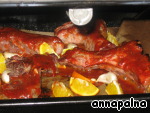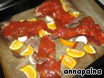 Рeбра посолить, в глубокий противень постелить бумагу для запекания и положить на нее ребра, запечь в разогретой до 200 градусов духовке 15 минут. Приготовить соус: смешать кетчуп, сахар, перец красный, сок половины апельсина и цедру апельсина, посолить. Зелень порубить и добавить в кетчуп. Вокруг ребер разложить чеснок (не чищеный) и кусочки апельсина, сверху полить все соусом! Запекать в духовке 25-30 минут.