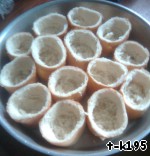 Нарезать багет на ровные кусочки, выбрать мякиш, подрезая острым ножом вдоль стенок. Если дно получилось дырявым, «отремонтировать» кружочком мякиша. -